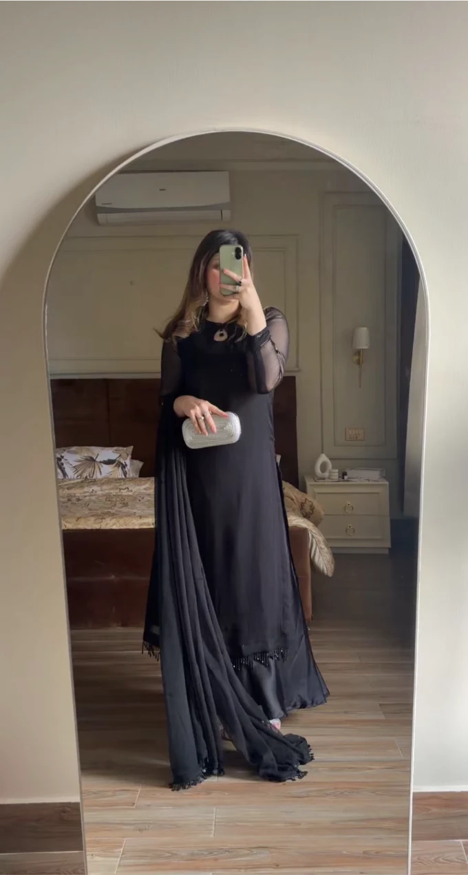 This elegant long chiffon shirt features a fluid, straight silhouette that falls gracefully, creating a soft and elongated look. Crafted from lightweight chiffon, it offers an airy drape with subtle movement. The sheer sleeves add a delicate touch, enhancing the overall sophistication of the outfit. Paired with flared silk trousers, the ensemble balances structure and flow—