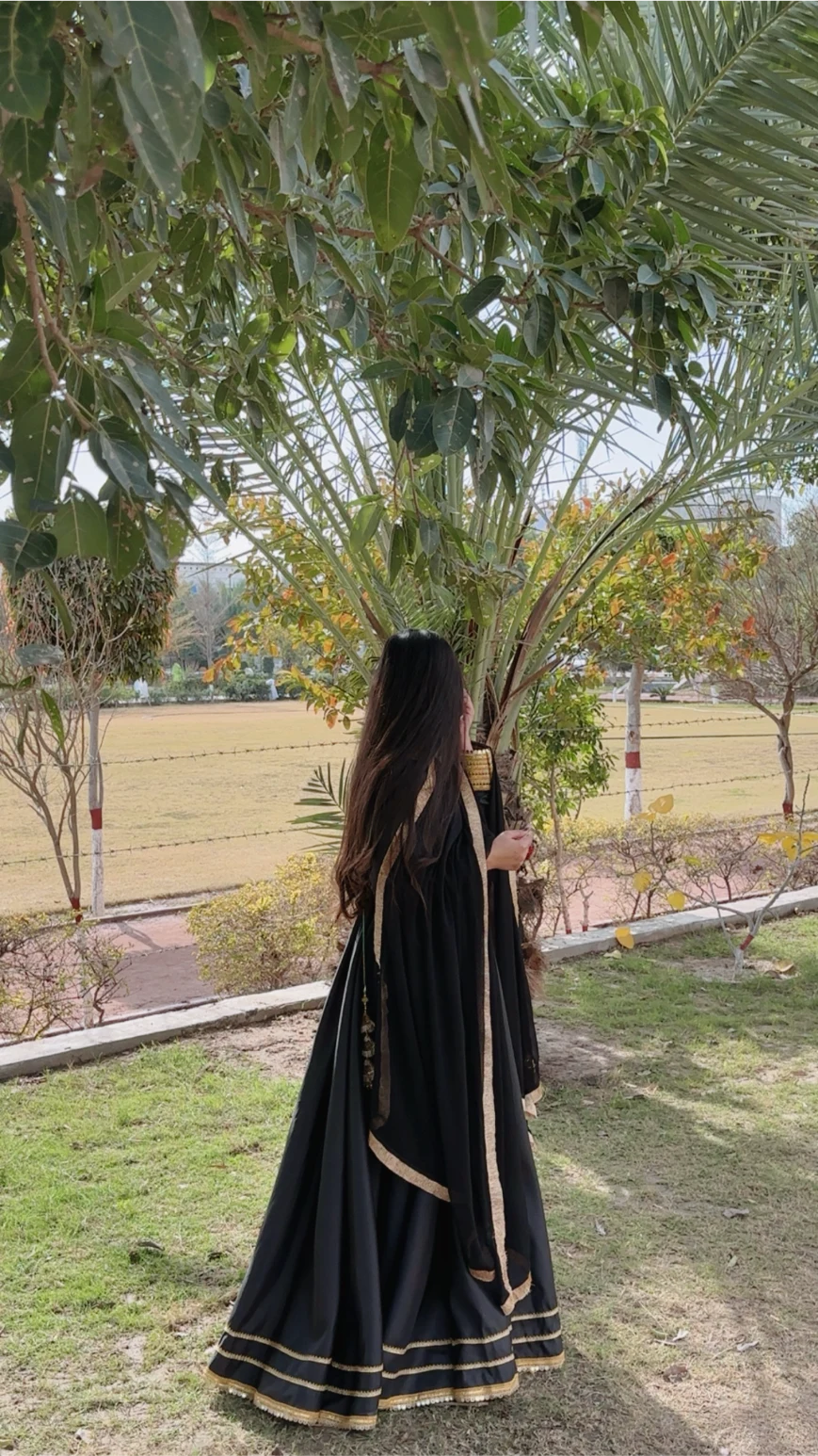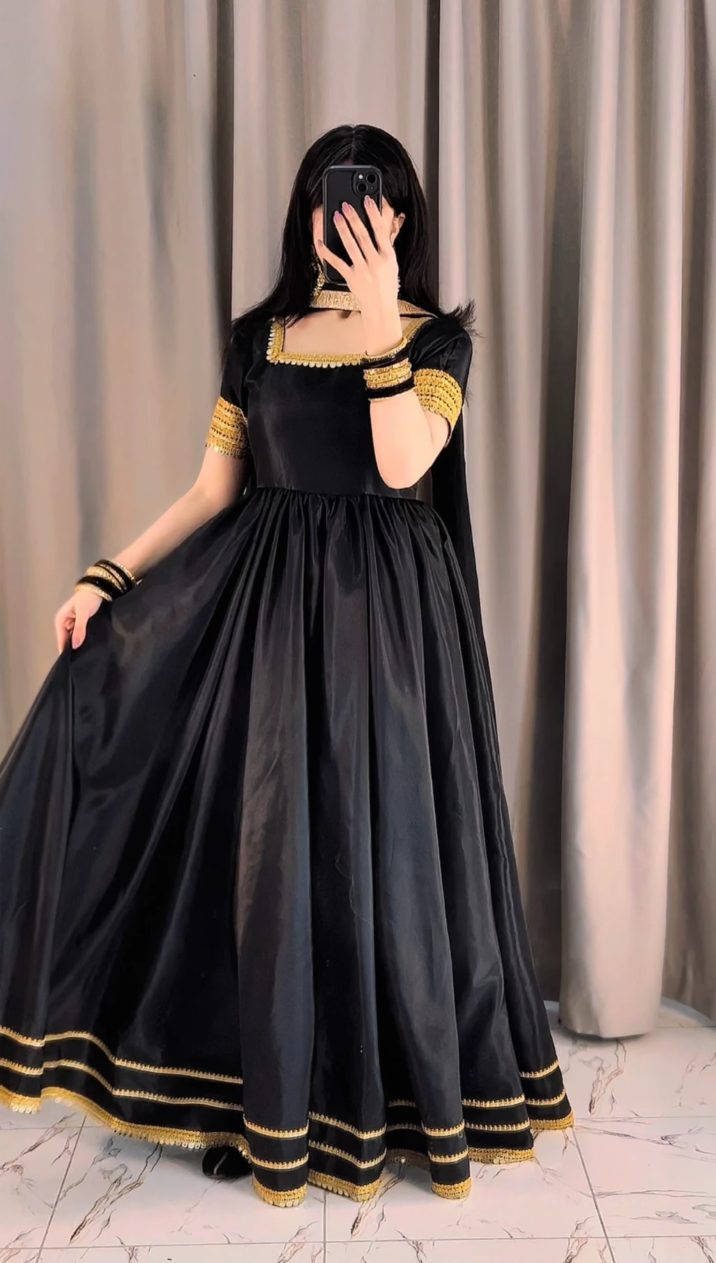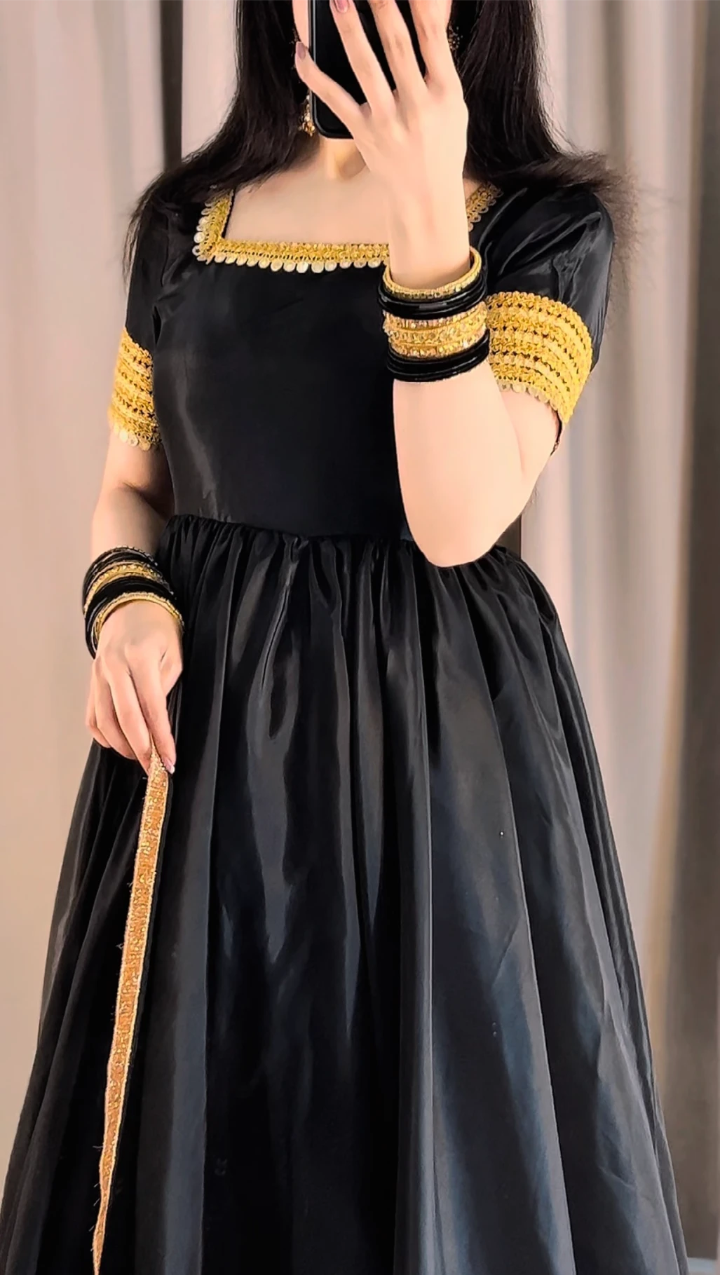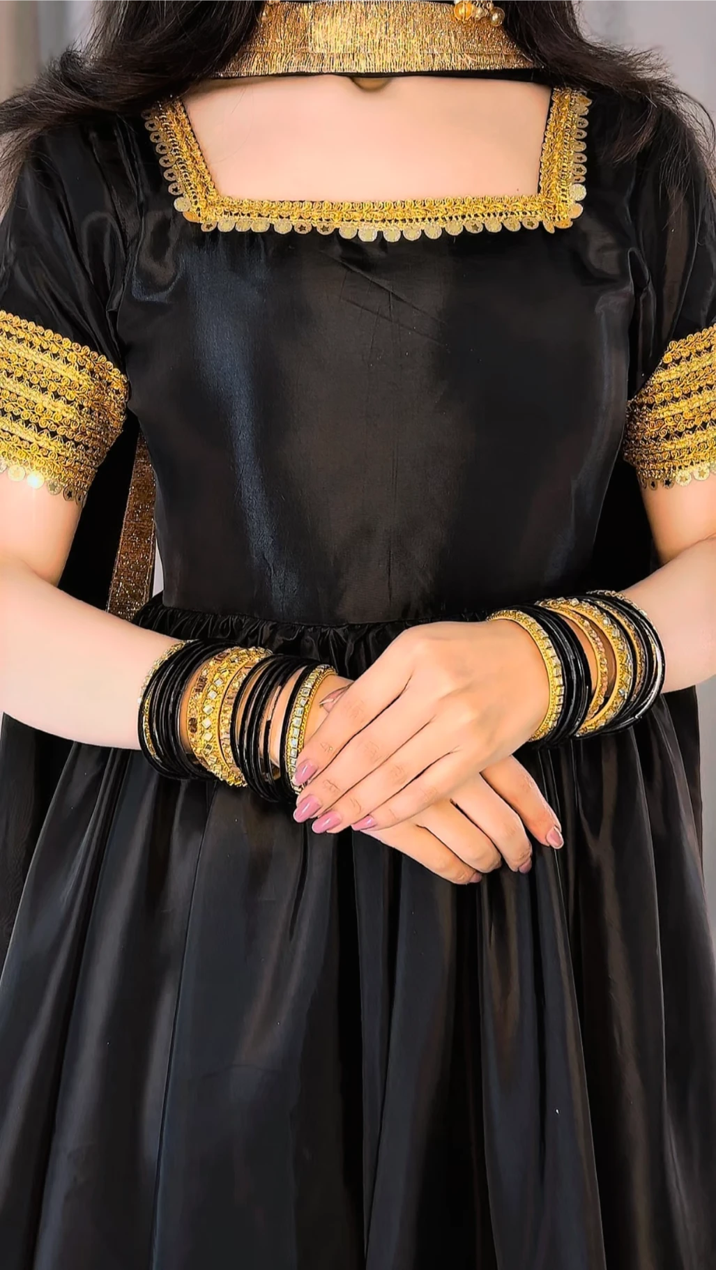 This graceful black frock is crafted in a flowing silhouette, designed to offer both elegance and comfort. The neckline is beautifully enhanced with intricate golden lace detailing, adding a refined and traditional touch. The short sleeves are adorned with matching lace work, perfectly complementing the neckline and elevating the overall look.