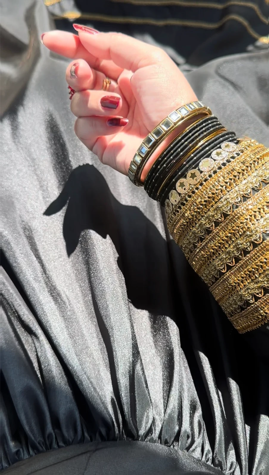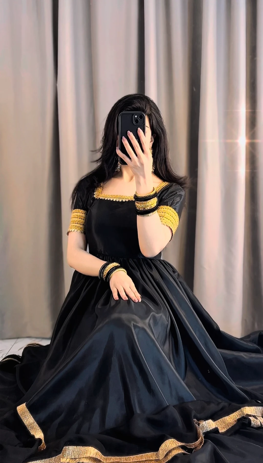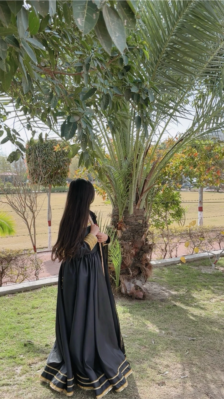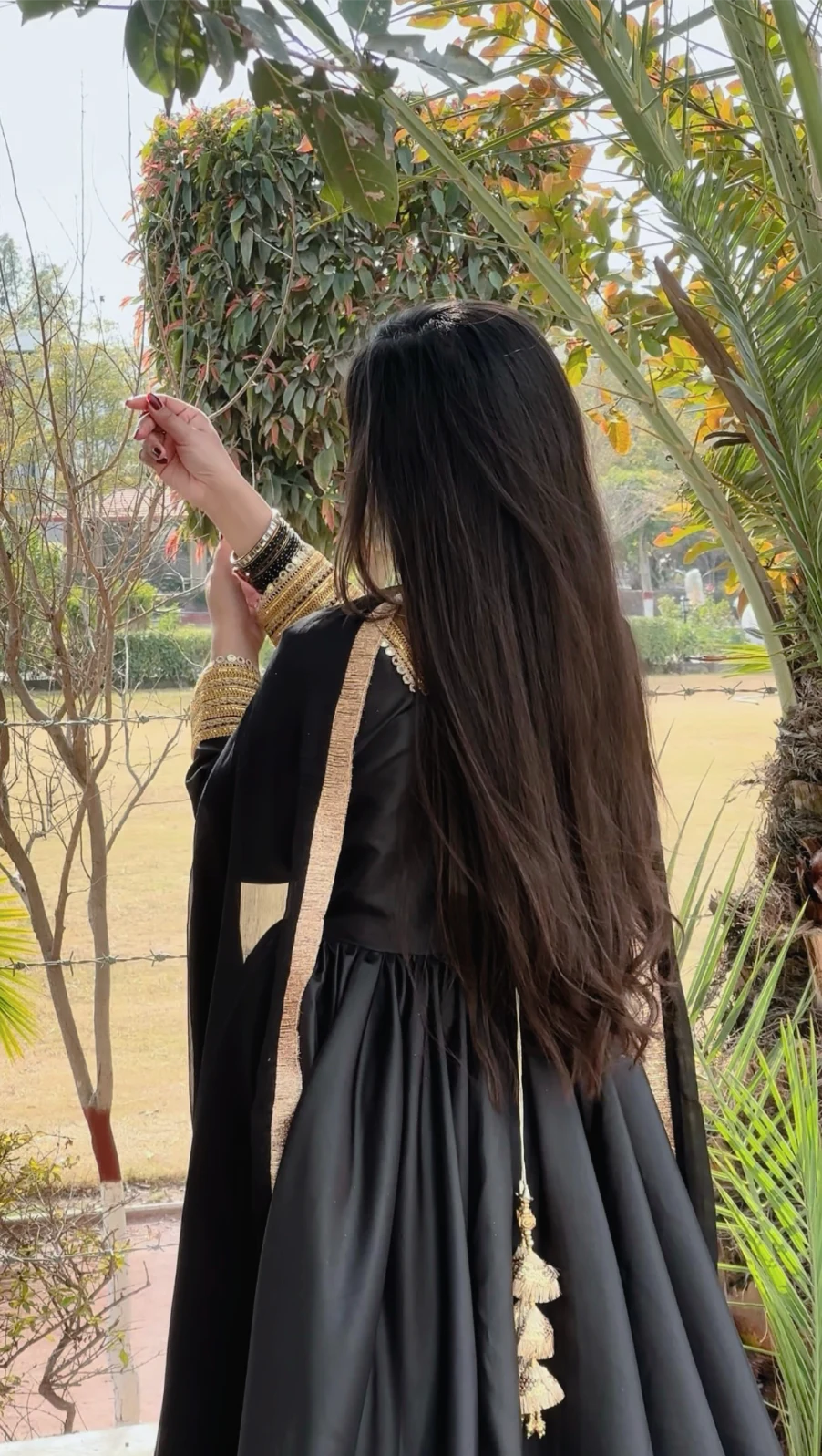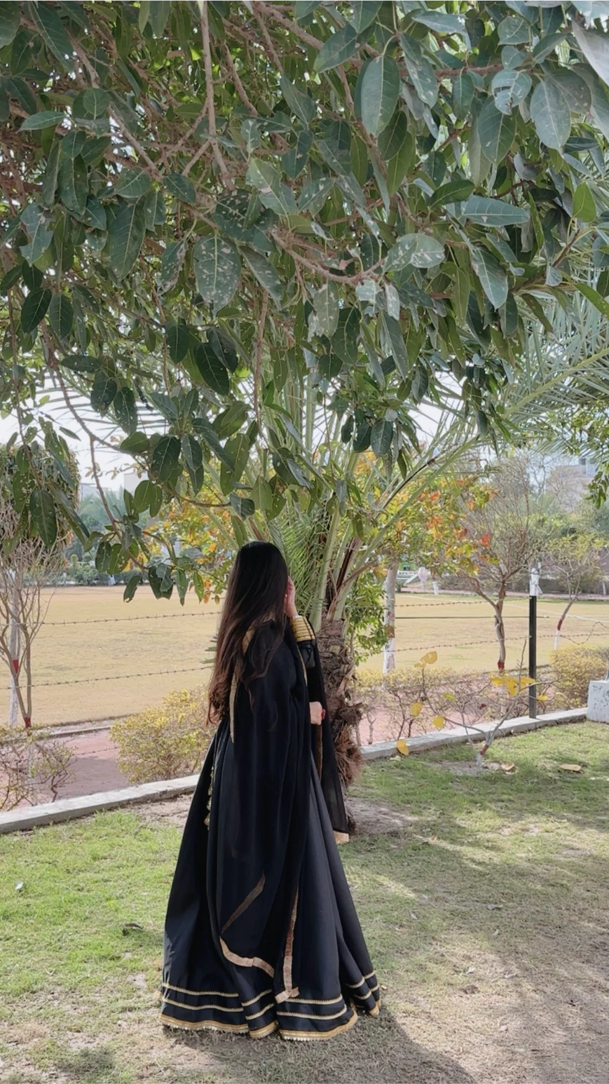 This graceful black frock is crafted in a flowing silhouette, designed to offer both elegance and comfort. The neckline is beautifully enhanced with intricate golden lace detailing, adding a refined and traditional touch. The short sleeves are adorned with matching lace work, perfectly complementing the neckline and elevating the overall look.
