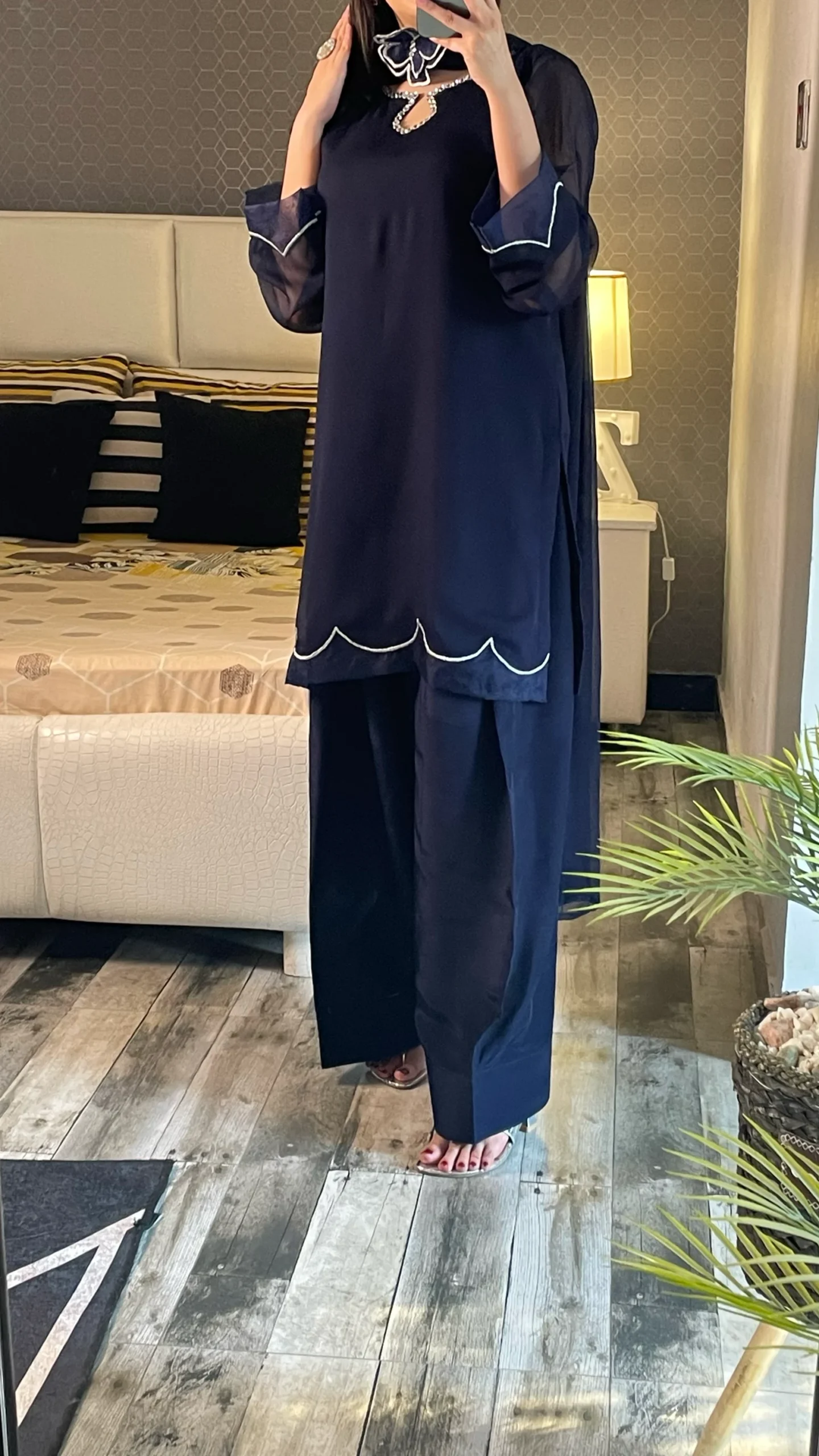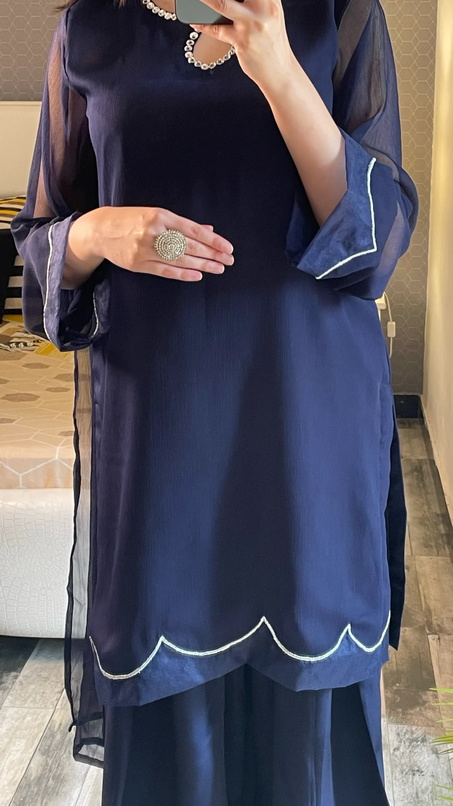 The shirt is designed in a soft, flowy chiffon fabric that drapes beautifully, giving a graceful and sophisticated look. It features delicate white scalloped detailing along the hem and sleeves, adding a subtle contrast. The neckline is the highlight of the outfit, adorned with stylish embellishments and cutwork, creating a refined and modern statement.