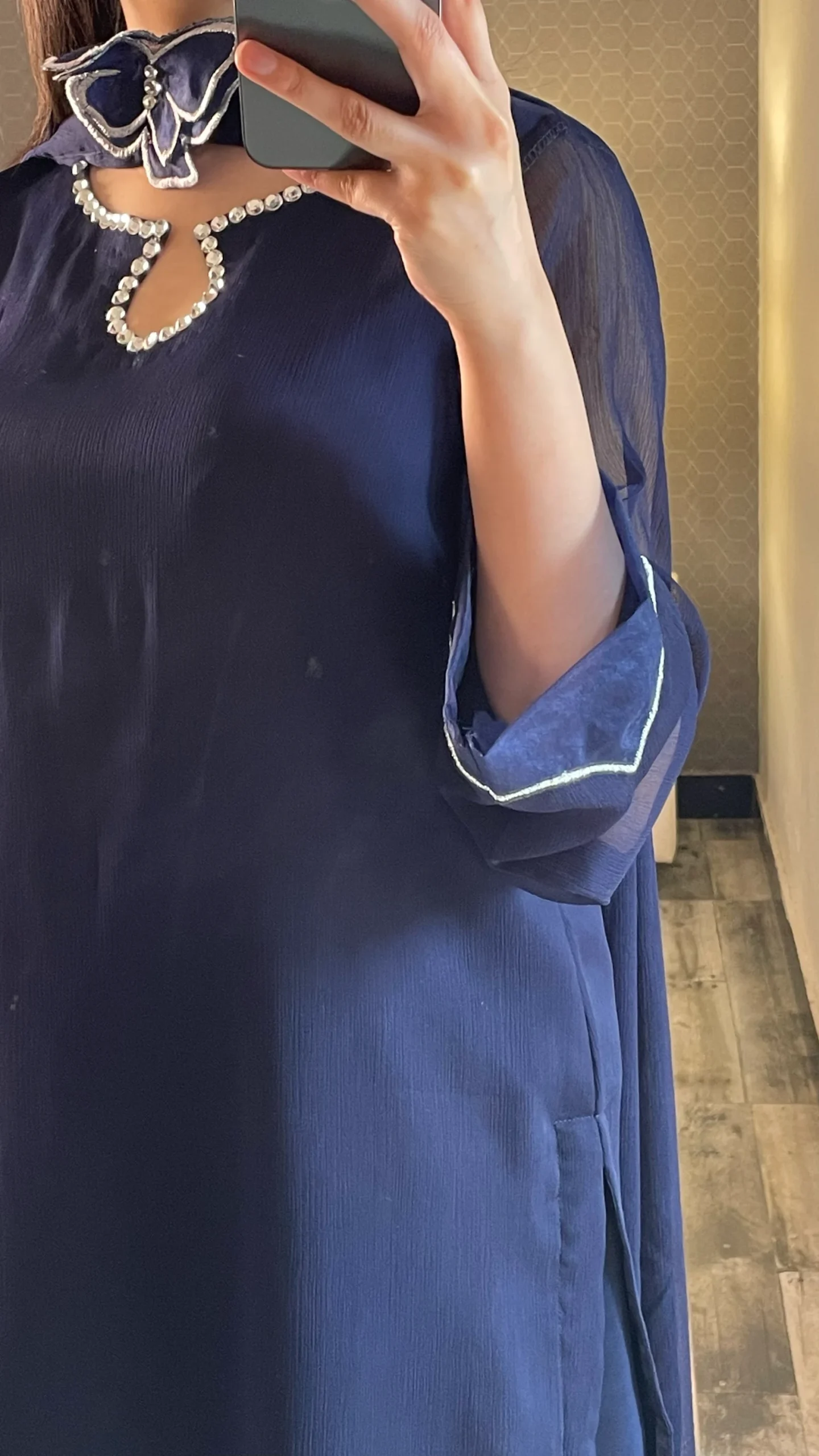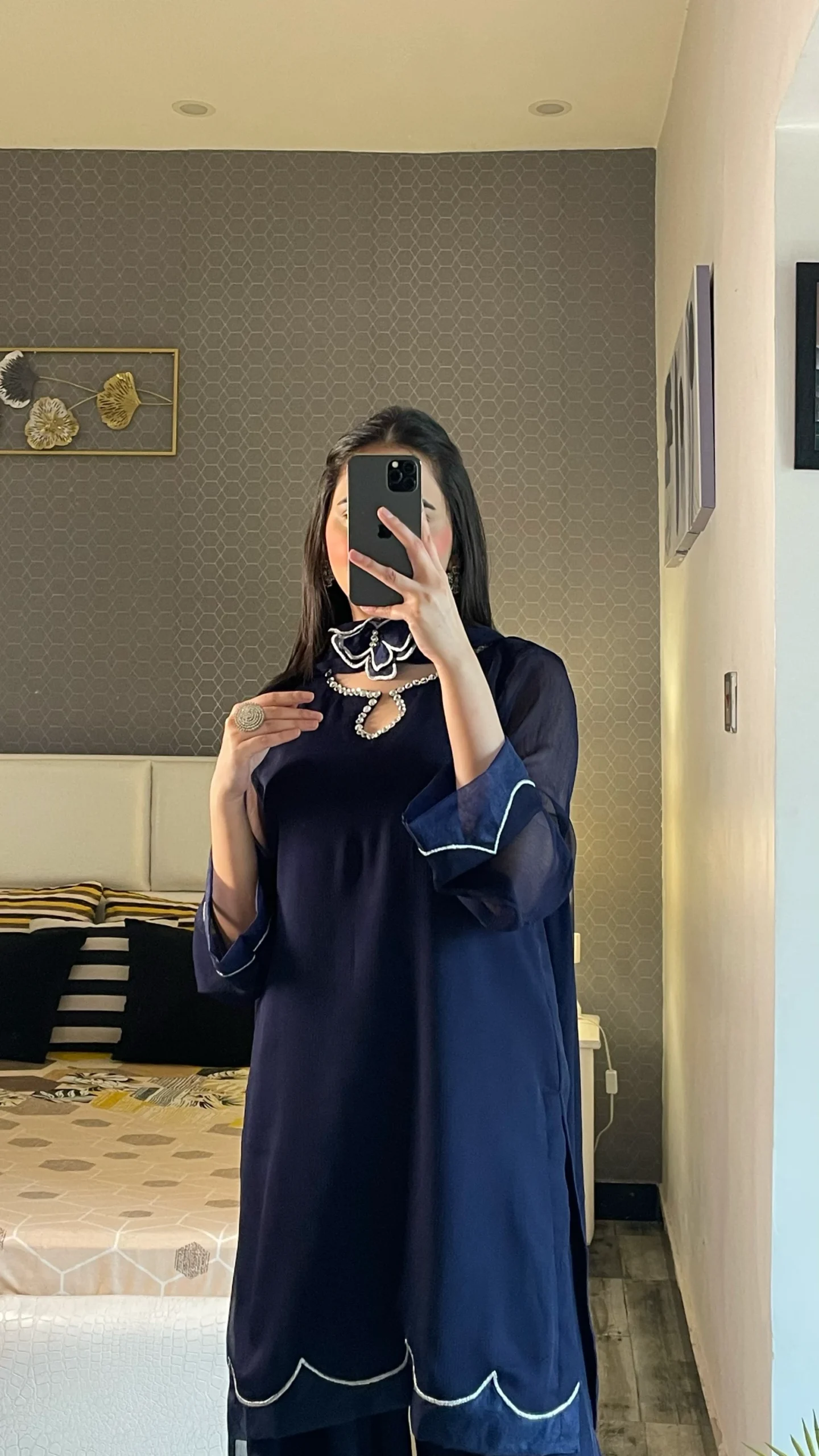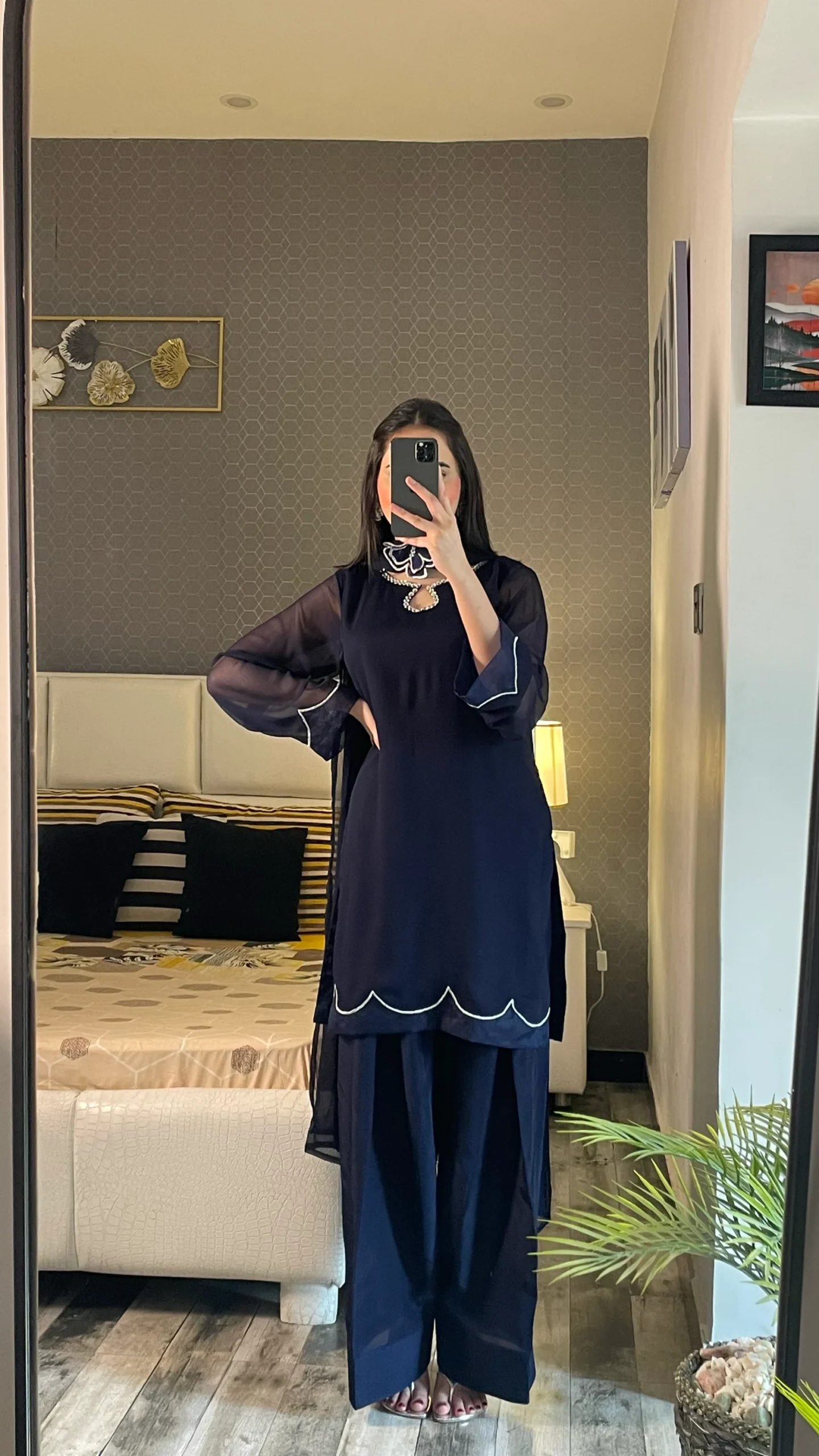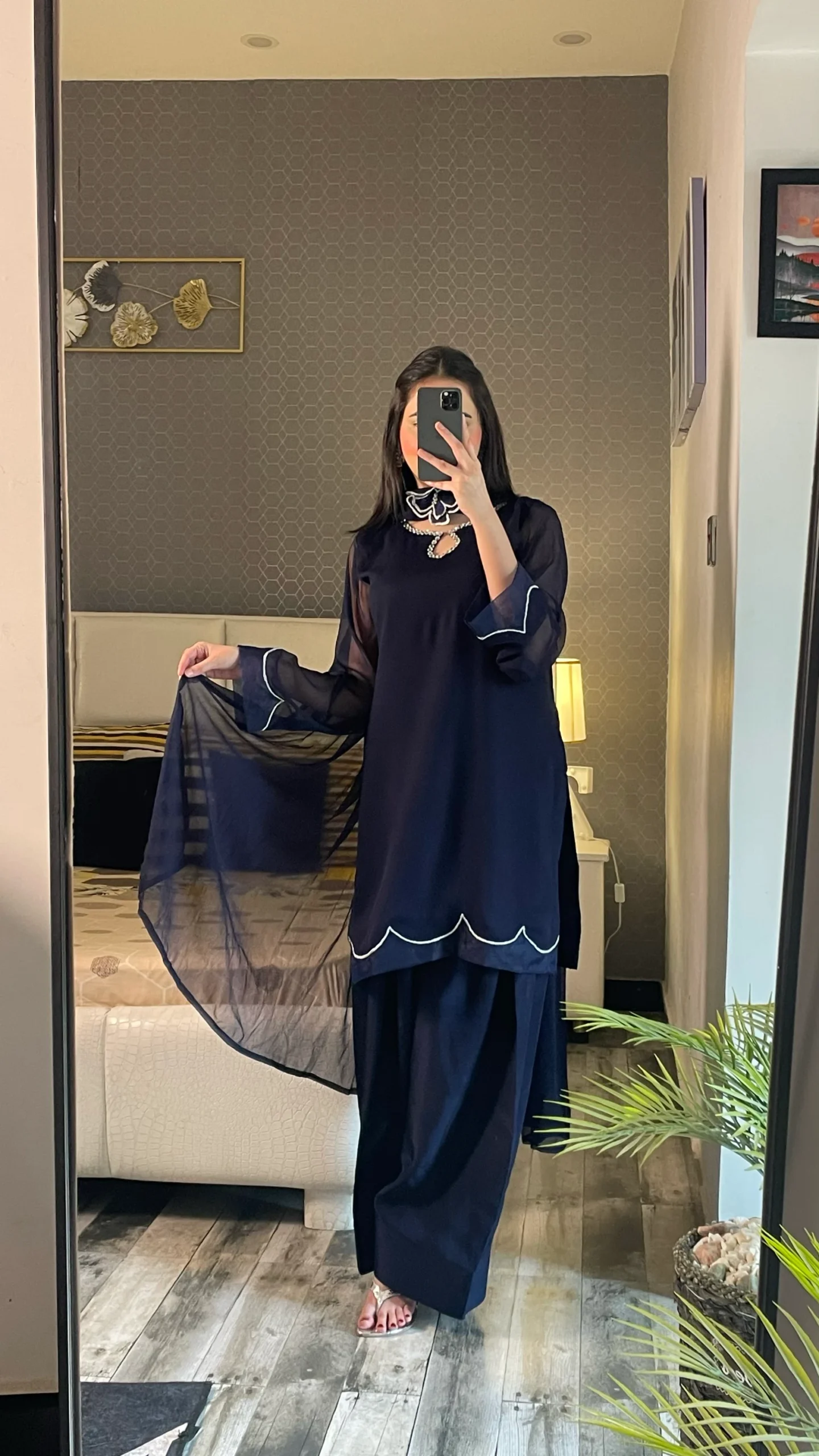 Elegant and timeless, this outfit features a navy blue chiffon shirt paired with a matching chiffon dupatta and grip trousers.
