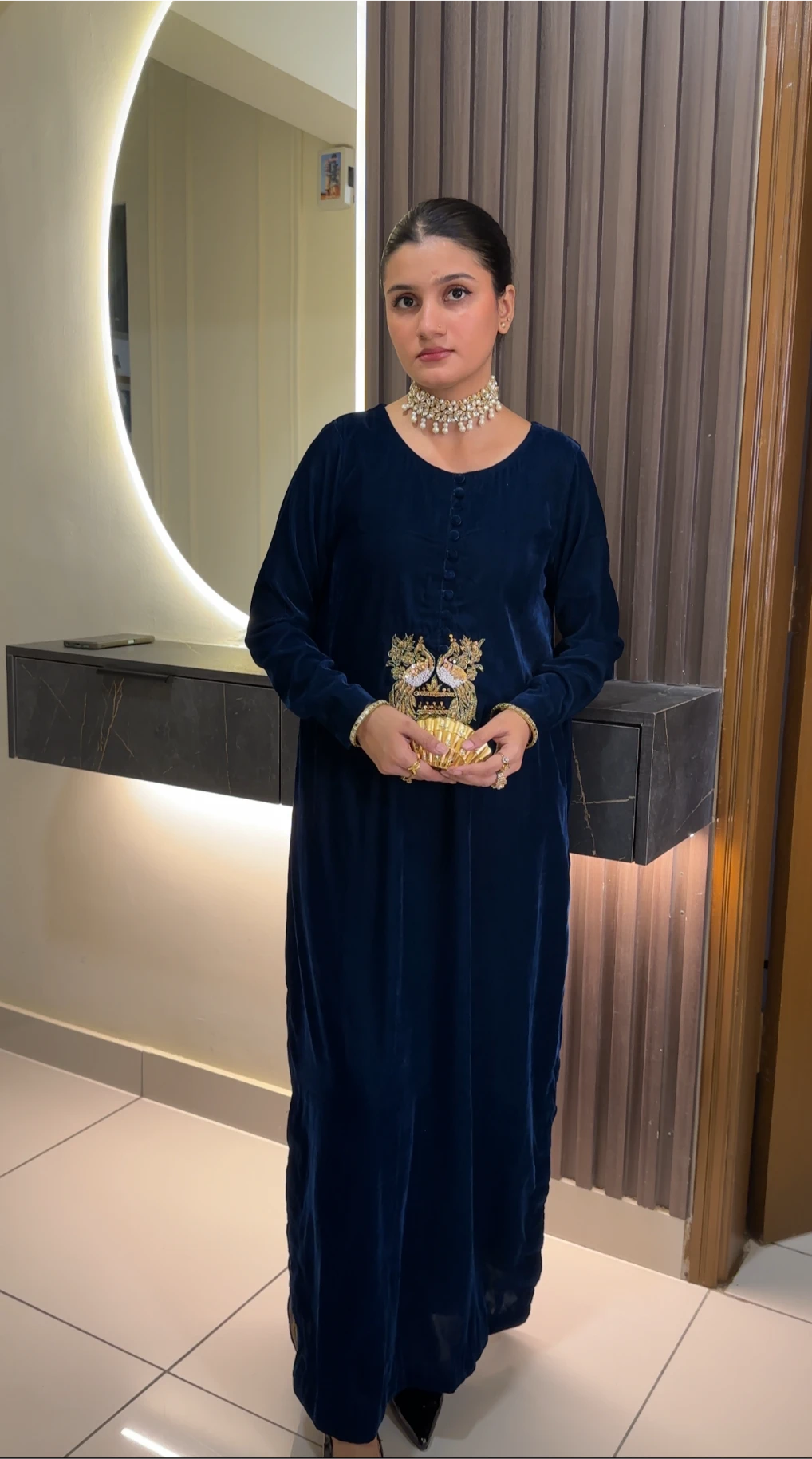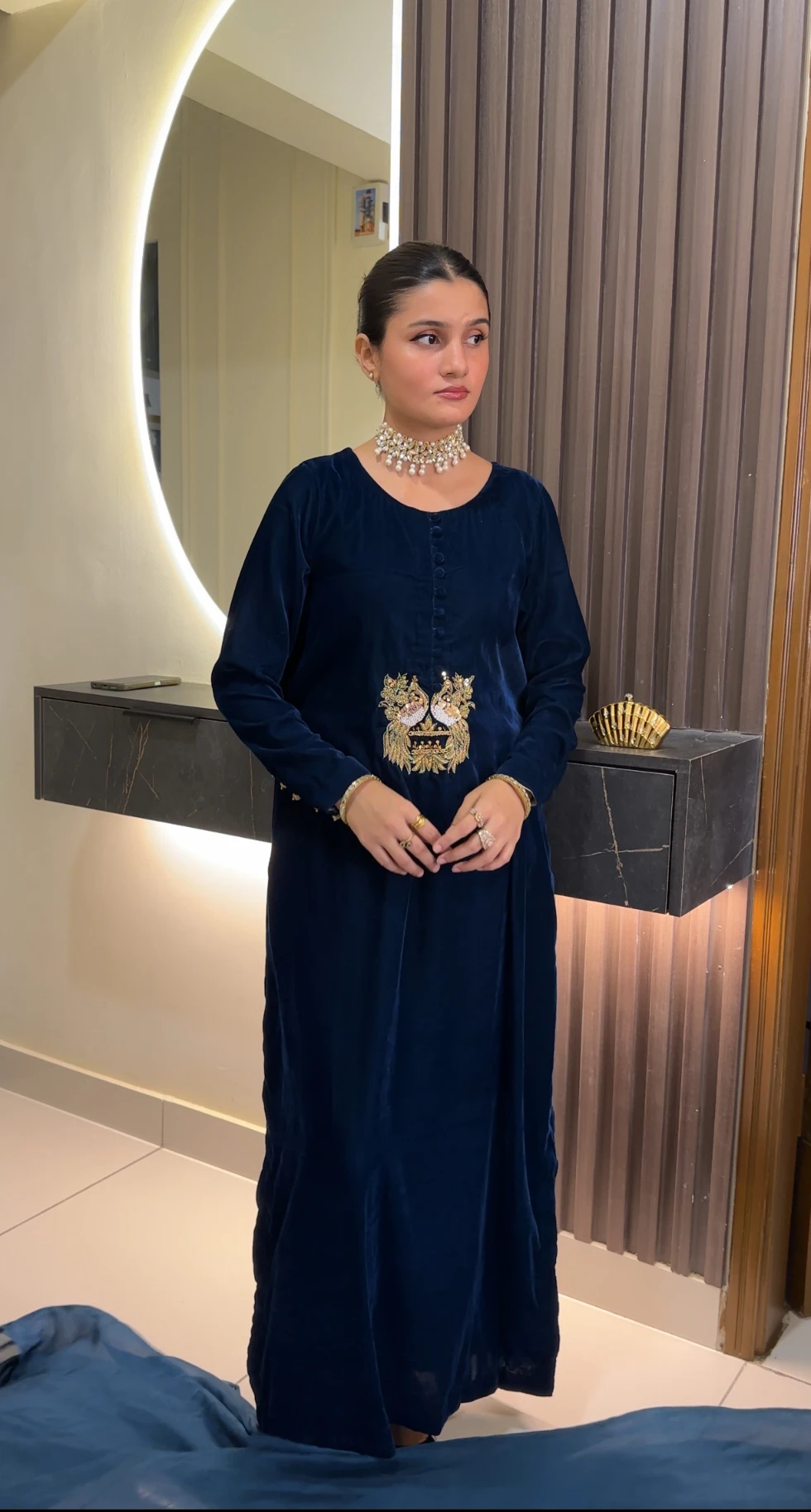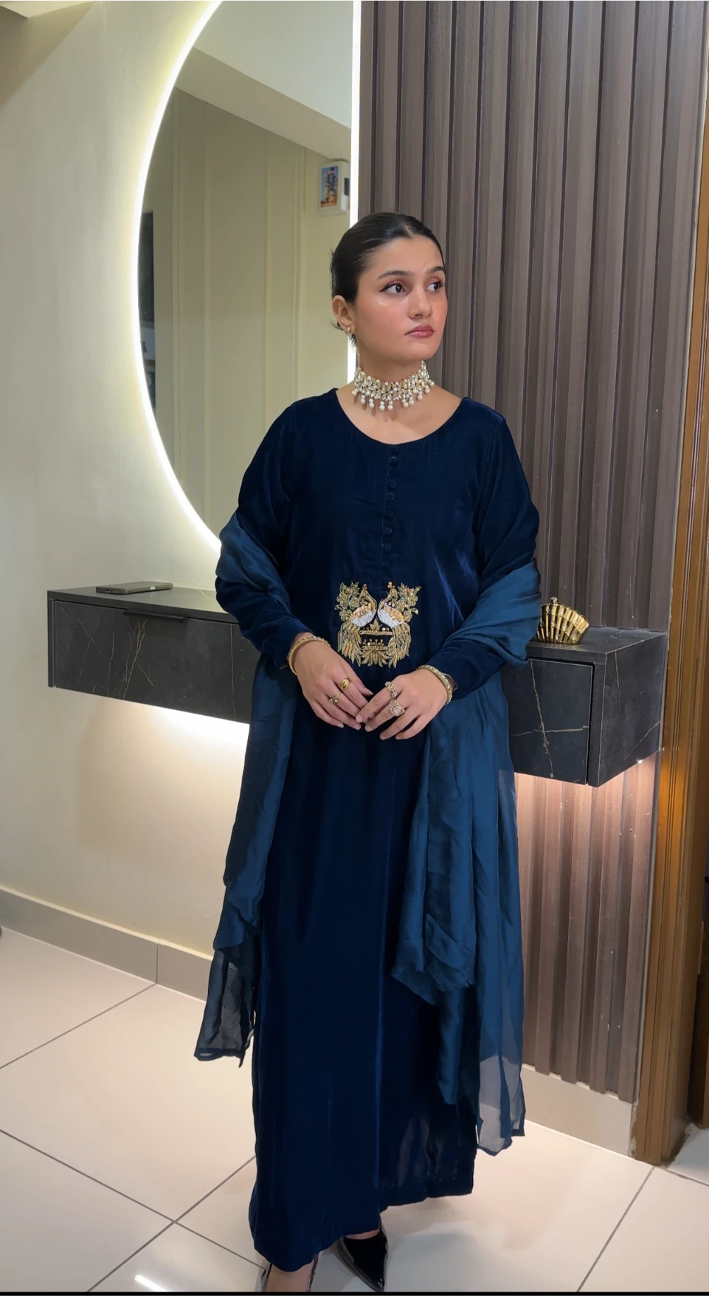 A standout feature is the intricate golden and white embroidery and handwork near the waist area, depicting two peacocks facing each other — a motif often associated with grace and luxury.