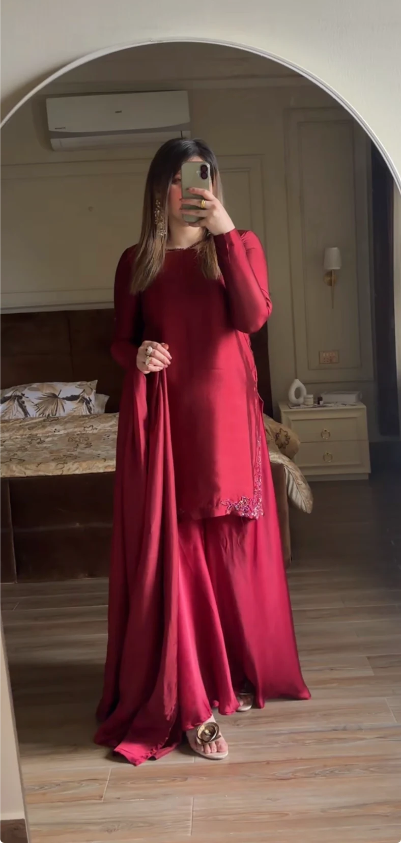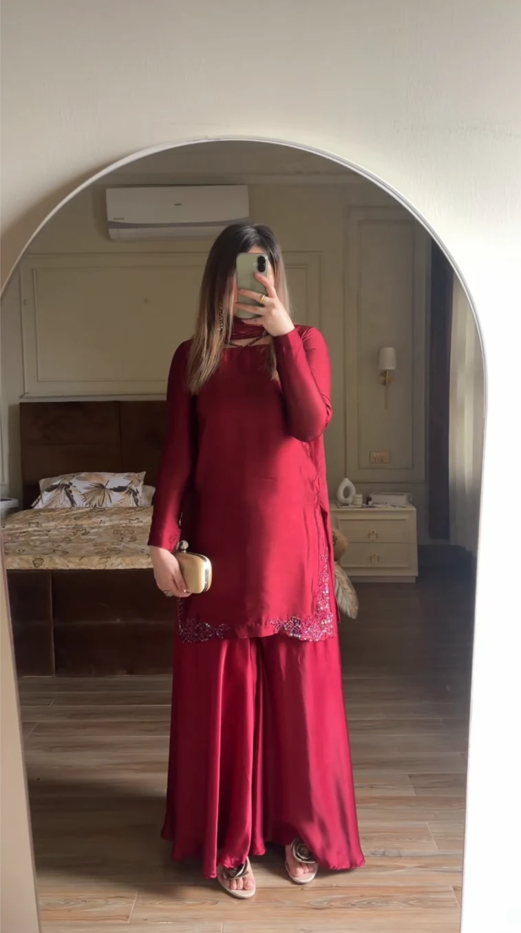 This refined ensemble features a sheesha silk short shirt tailored in a sleek, straight cut, offering a subtle sheen and a rich, luxurious feel. The shirt is beautifully enhanced with delicate handwork along the borders, adding an artisanal touch and understated elegance. Paired with silk flared trousers, the outfit creates a graceful flow—the trousers flare softly from the waist, lending movement and balance to the structured shirt. Completed with a matching silk duppatta, this timeless combination is perfect for festive occasions, formal gatherings, and intimate celebrations.