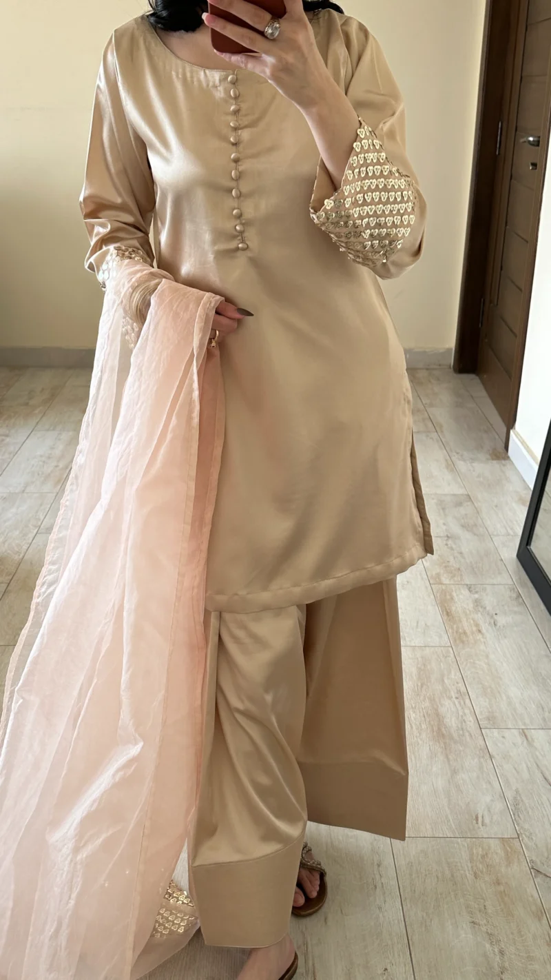 Imported silk short shirt (34 inches length) having sequence work on sleeves and dupata