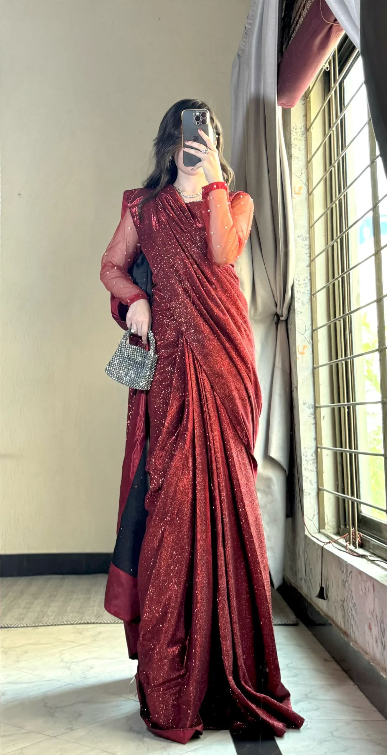 Shimmering like a star in this glittery saree, ready to dazzle the wedding season.