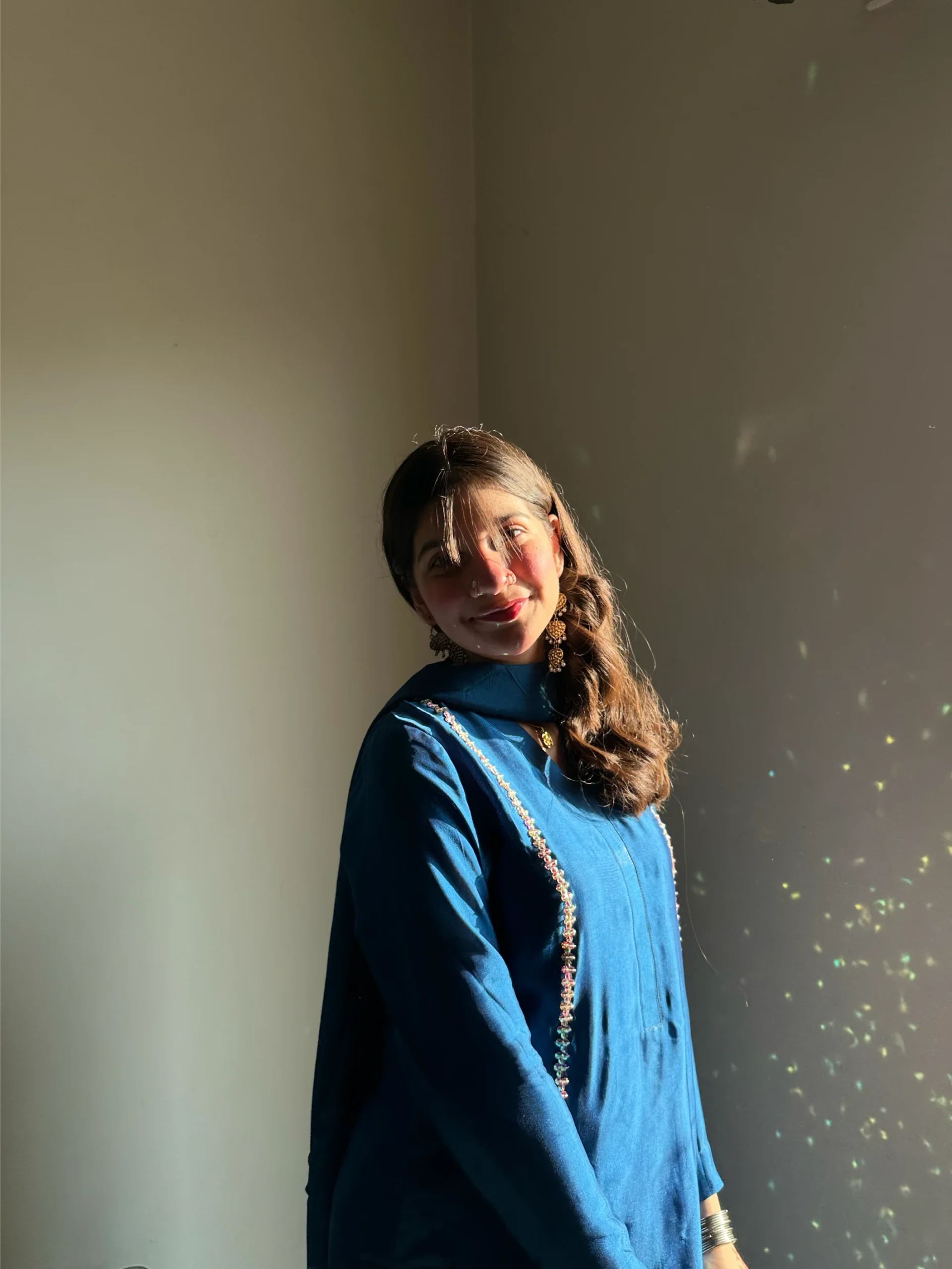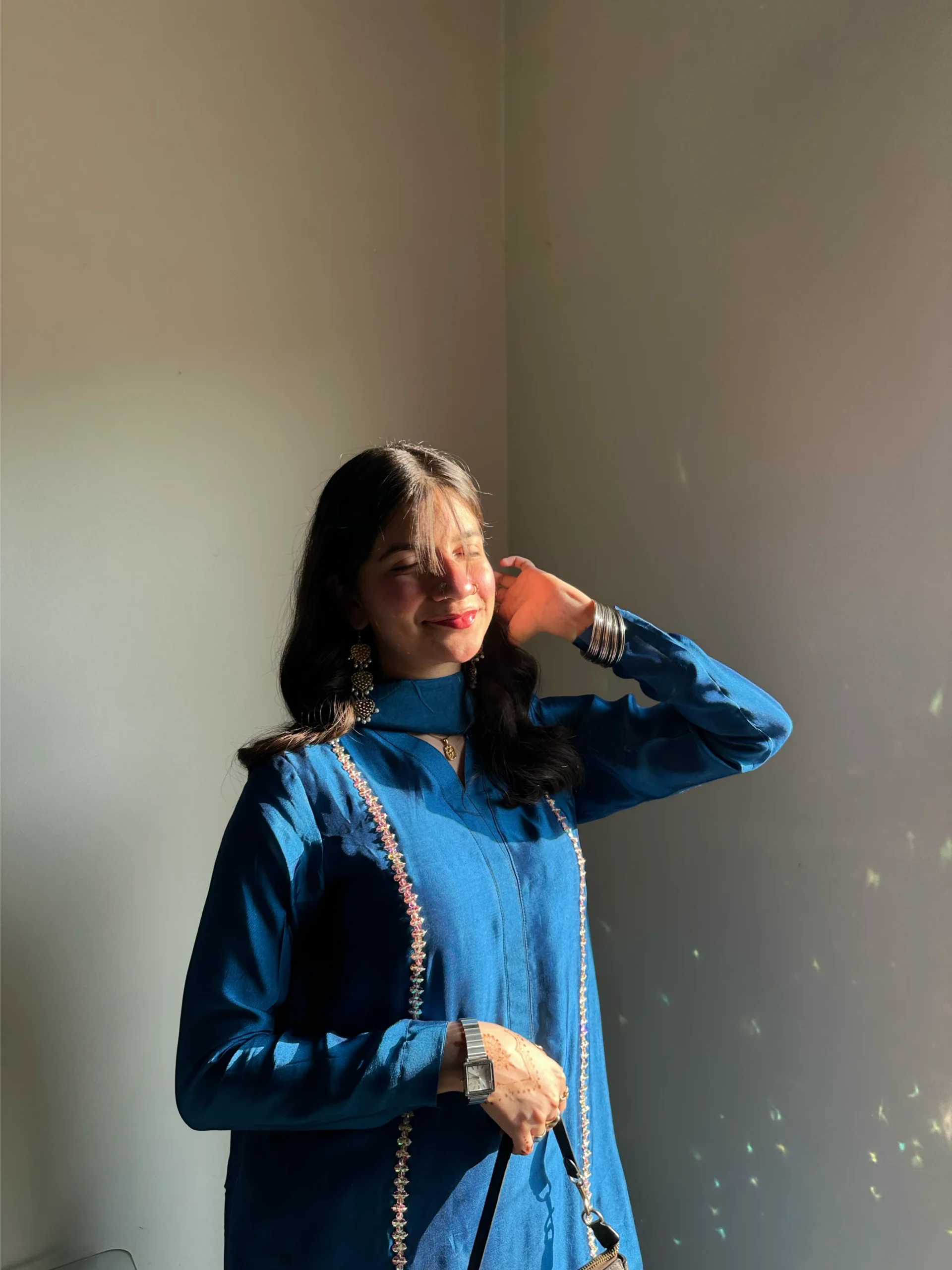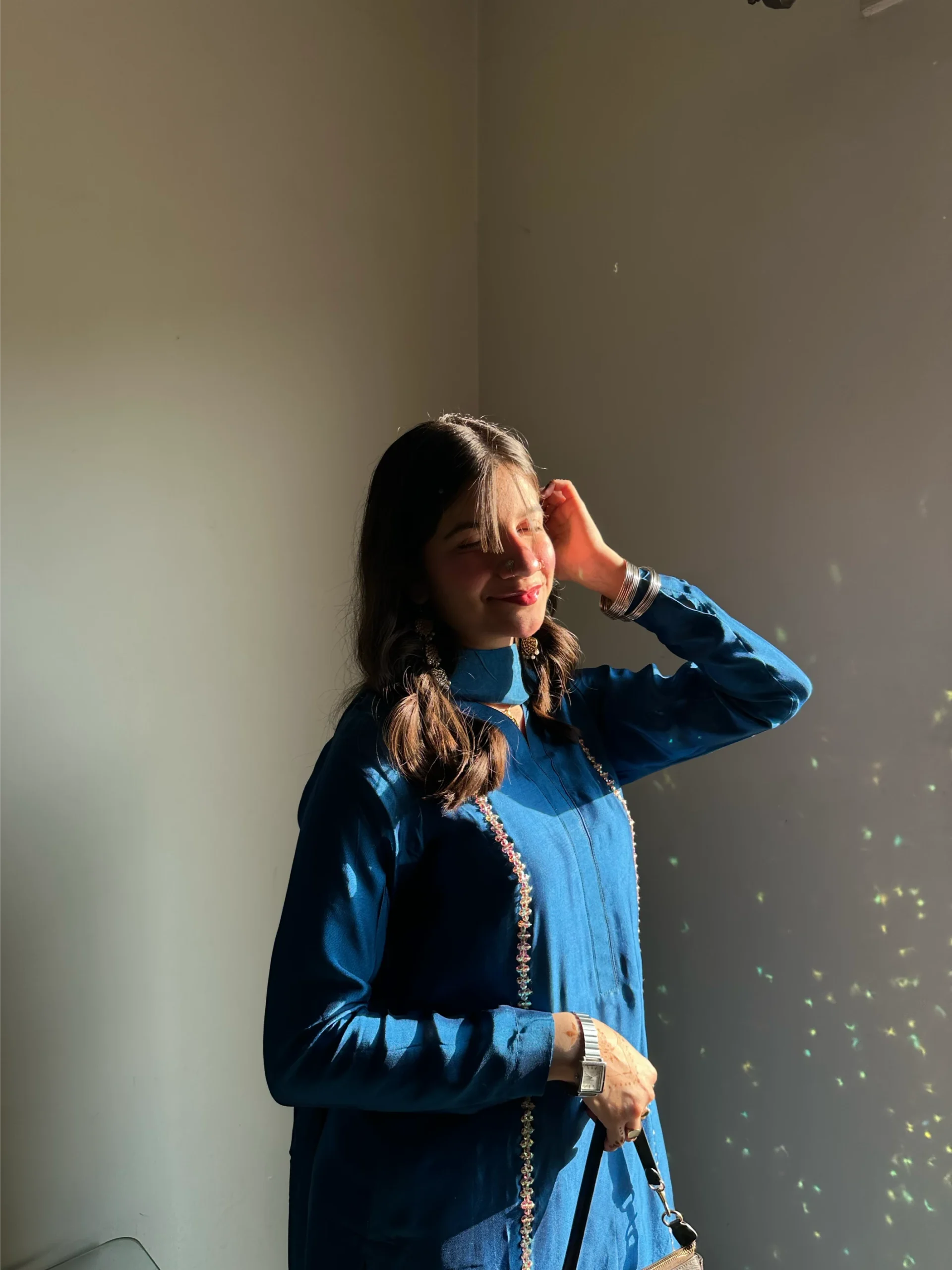 A beautifully tailored short shirt in rich blue sheesha silk, adorned with Muse Luxe stones hand-embroidered detailing. The delicate stone work adds a refined sparkle that elevates the piece without overpowering it.