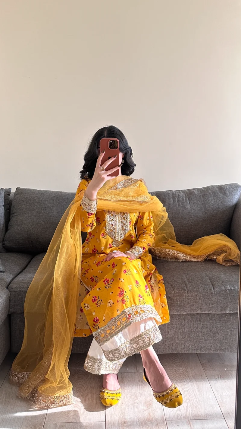 Celebrate Eid in radiant style with this yellow floral lawn suit, adorned with intricate gotta work. The soft lawn fabric ensures all-day comfort, while the vibrant floral print brings a fresh and festive touch to your look. Delicate gotta embellishments add a hint of shimmer, perfect for capturing the spirit of celebration. This elegant ensemble combines traditional charm with modern grace—ideal for daytime Eid gatherings or evening festivities.